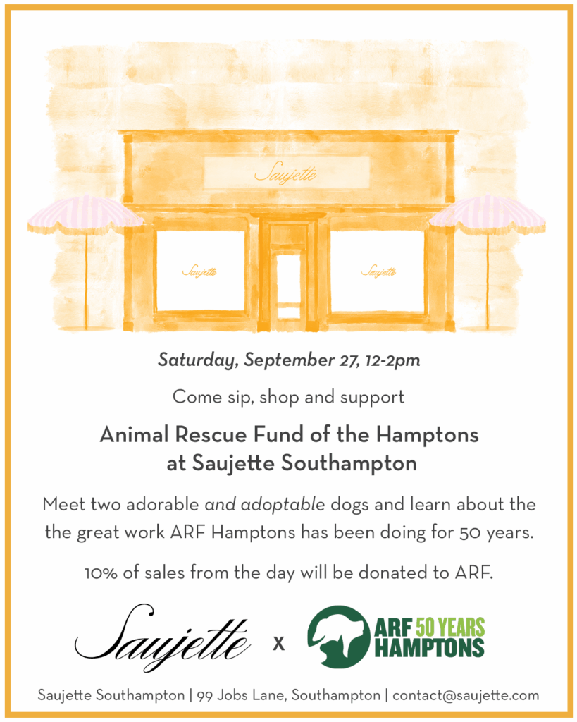 Shop in support of ARF at Saujette, on Job’s Lane in Southampton. Part of the proceeds will be donated to ARF, plus meet some adoptable dogs between 12 and 2 PM.